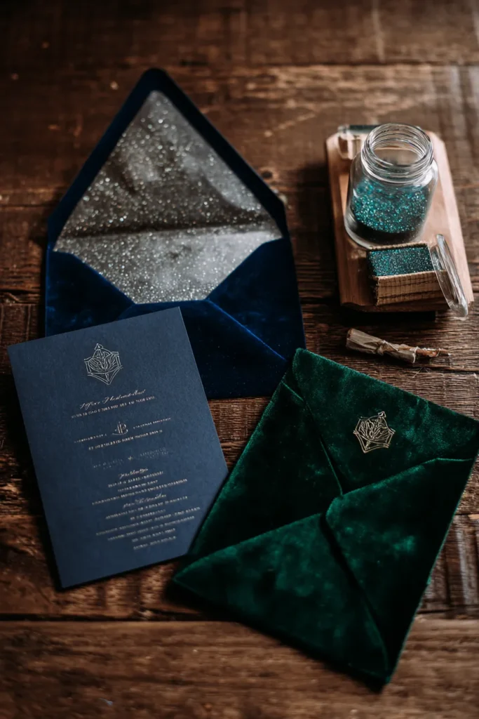 I am just completely obsessed with this entire vibe. The velvet envelopes feel so incredibly rich and royal, perfect for making guests feel special before the event even begins. I love how the moody, dark colors feel so sophisticated and romantic. That glitter liner is seriously the perfect touch of fairytale sparkle. If I got this in the mail, I would know I was in for an unbelievably elegant and magical night.