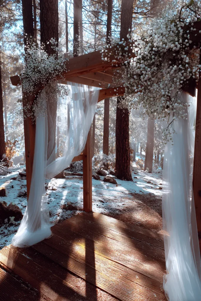 This altar is pure, serene forest magic and feels straight out of a beautiful fairytale. A simple, natural wooden arch with a sturdy platform stands nestled among tall, snow-dusted pine trees. The structure is beautifully softened by swathes of sheer white fabric draped around the posts and huge, lush arrangements of baby’s breath, which look exactly like freshly fallen snow. Sunlight streams through the trees, creating a glorious, ethereal lighting effect on the snowy ground and the wooden platform.