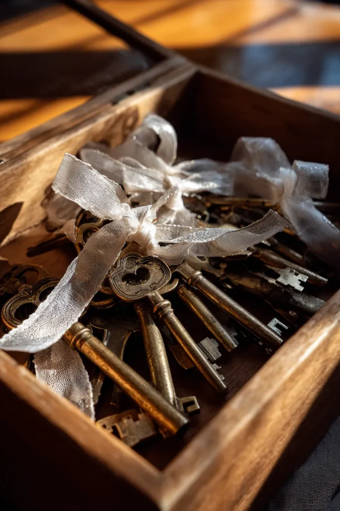 This is such a charming and thoughtful detail that feels straight out of an old library or a secret garden gate. A collection of antique bronze and brass skeleton keys is displayed in a raw, warm wooden box. They are loosely tied together with a simple, delicate sheer white ribbon, which softens the industrial look of the metal. The whole presentation is bathed in gorgeous, warm light, making the brass shimmer and highlighting the beautiful patina of the wood.