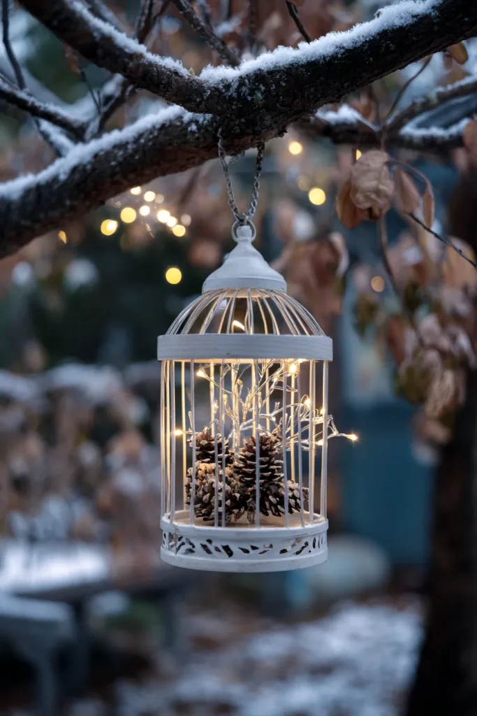 This hanging decoration is such a whimsical way to bring light and nature into a winter theme. A classic white birdcage has been repurposed into a beautiful lantern, hanging from a snow-dusted tree branch. Inside, you see a collection of natural pinecones nestled among a bright cluster of tiny, warm-toned fairy lights. The whole piece brings that cozy, rustic feel outdoors, and the hint of snow on the branch makes it feel perfectly seasonal.