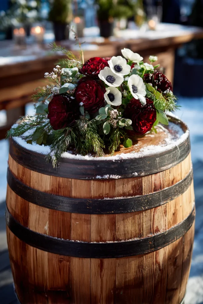 I think this is such a brilliant and simple idea for outdoor winter decor. It perfectly combines the cozy, rough texture of the wood and snow with the intense, romantic colors of the flowers. Those dark red roses and the white anemones with their dramatic black centers are just stunning, and the little pine sprigs tie it all back to the winter woodland theme. It’s elegant without trying too hard, and I love how elevated the simple barrel looks.