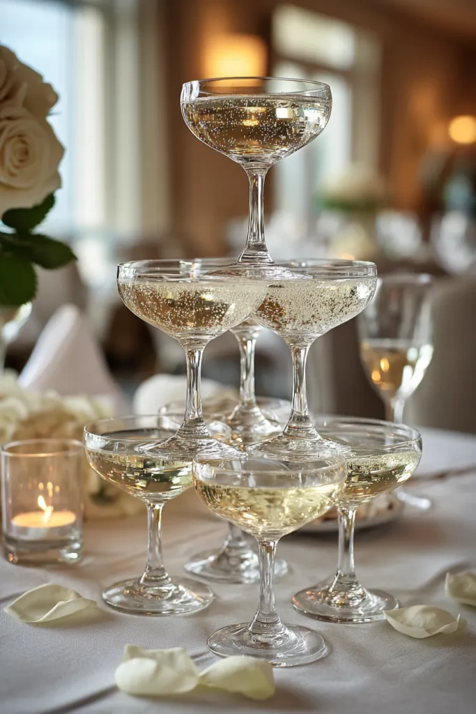 If you’re looking for a photo opportunity that screams celebration, this is definitely it. I just love how the classic coupe shape feels instantly vintage and incredibly chic. There’s something so luxurious and fun about a champagne tower; it just immediately tells your guests they’re in for a festive night. It’s a beautiful way to honor tradition while adding a touch of sophisticated sparkle to your event.