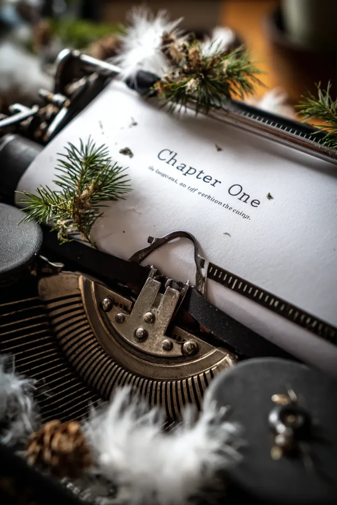 This beautiful detail gives a subtle, charming nod to the whole “storybook” theme. A vintage black typewriter holds a single sheet of crisp white paper that simply reads “Chapter One” in an elegant font. The space around the typewriter is styled with cozy, natural elements like soft white feathers and small pine sprigs. It’s a beautifully styled vignette that feels intimate and personal, like the beginning of a beautiful love story.