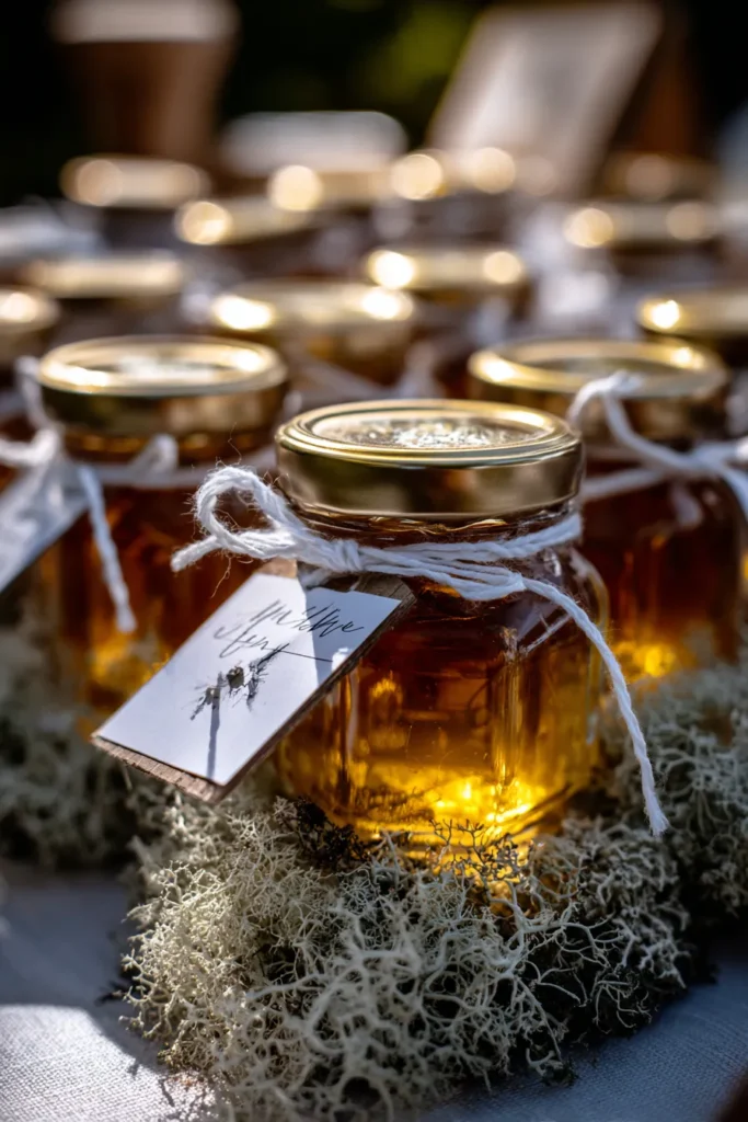 I think this is such a sweet idea that guests will actually use and love. I adore how the golden honey glows through the glass, especially with the little bit of light catching the brass lids. The use of that soft, pale moss as a decorative bed is just brilliant; it makes the whole thing feel so organic and natural. It’s a beautiful, warm, and intimate way to thank your guests for being part of your “sweet” new chapter.