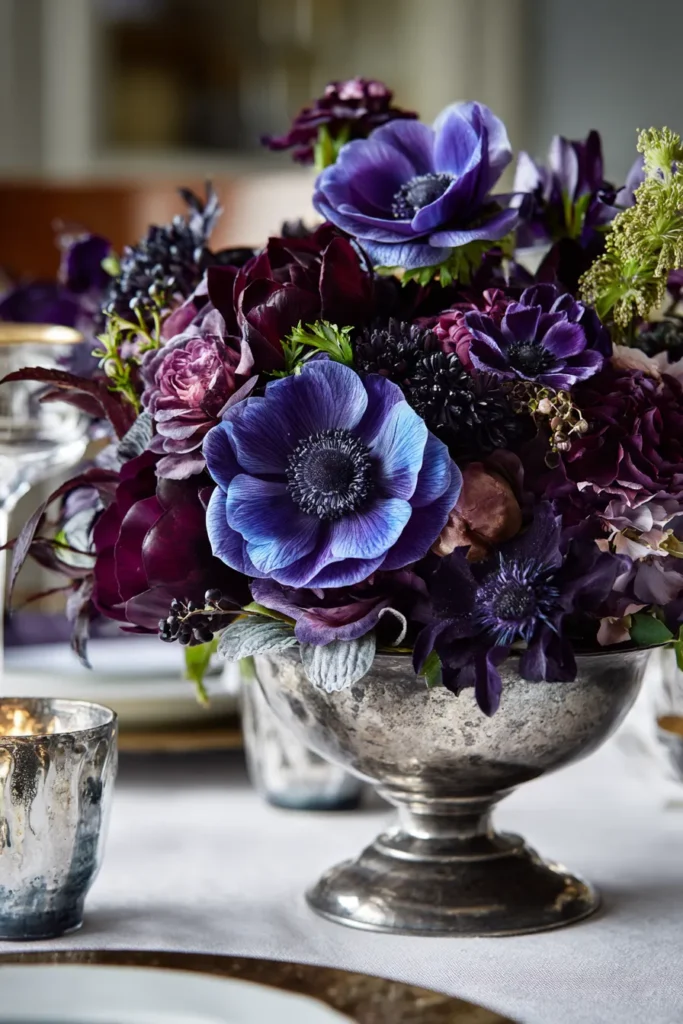 If you’re not afraid of dark, gorgeous colors, this is a beautiful choice. I think the rich purples and burgundies feel instantly opulent and regal, which is a perfect fit for a grand winter celebration. I love how the vintage silver bowl adds that touch of old-world elegance. The intensity of those vibrant blue anemones is just breathtaking; they really pop against the darker background and make the whole arrangement feel so lush and luxurious.