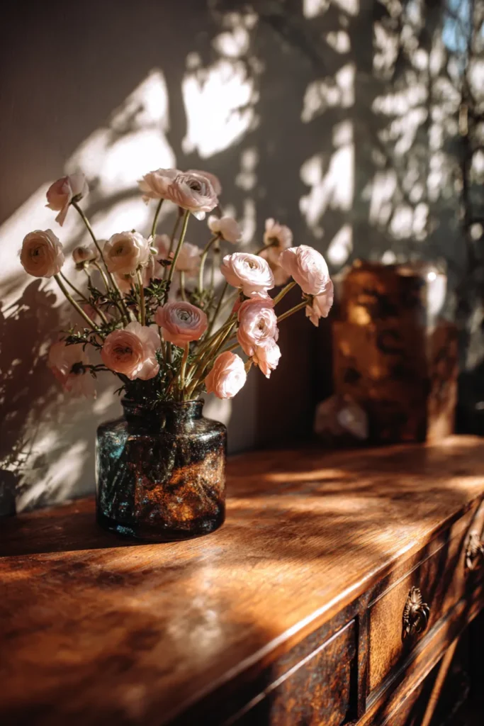 This little corner just screams romance. You have a beautiful arrangement of blush-pink ranunculus, looking all soft and delicate in a dark, textured glass vase. It’s all set on a gorgeous, warm antique wooden console or dresser, the kind with those lovely vintage-style drawer pulls. The best part is the lighting. The whole scene is bathed in that dreamy, golden-hour sunlight, casting artistic, dappled shadows on the wall. It’s a simple setup but feels so intentional and warm.