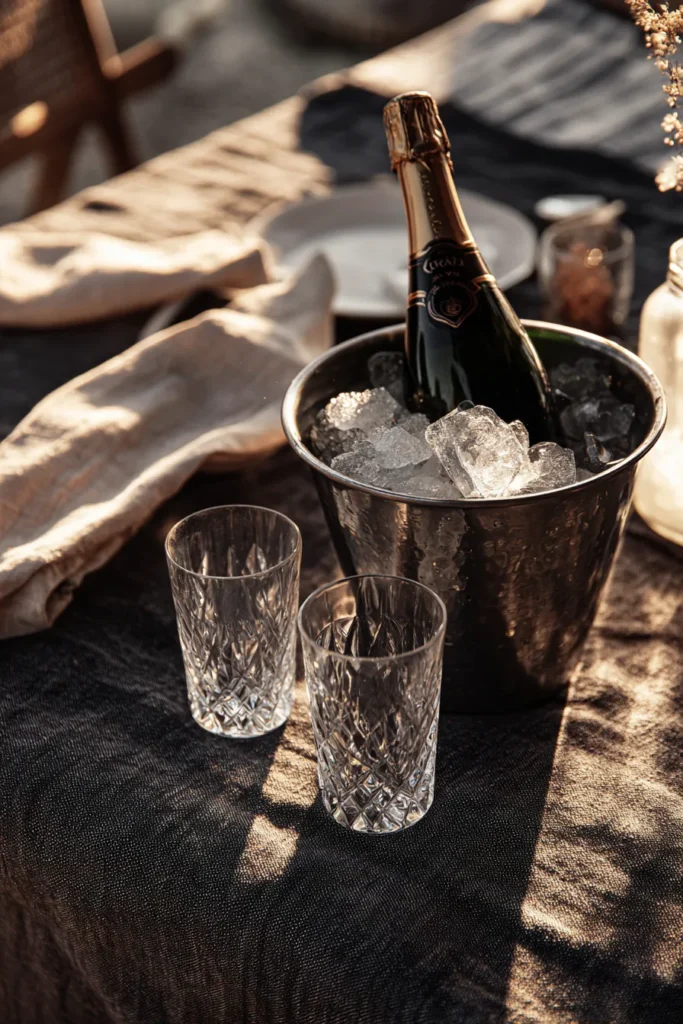This setup is the perfect blend of casual comfort and luxury. It features a dark, textured linen cloth, which creates a rich backdrop for all the sparkling elements. A gorgeous metallic ice bucket is overflowing with crushed ice, keeping a bottle of bubbly perfectly chilled. Right next to it sit two absolutely stunning crystal tumblers with a classic cross-hatch pattern that catches the sunlight beautifully. There are also soft, natural linen napkins draped casually nearby, adding an undone, relaxed feel to the scene.
