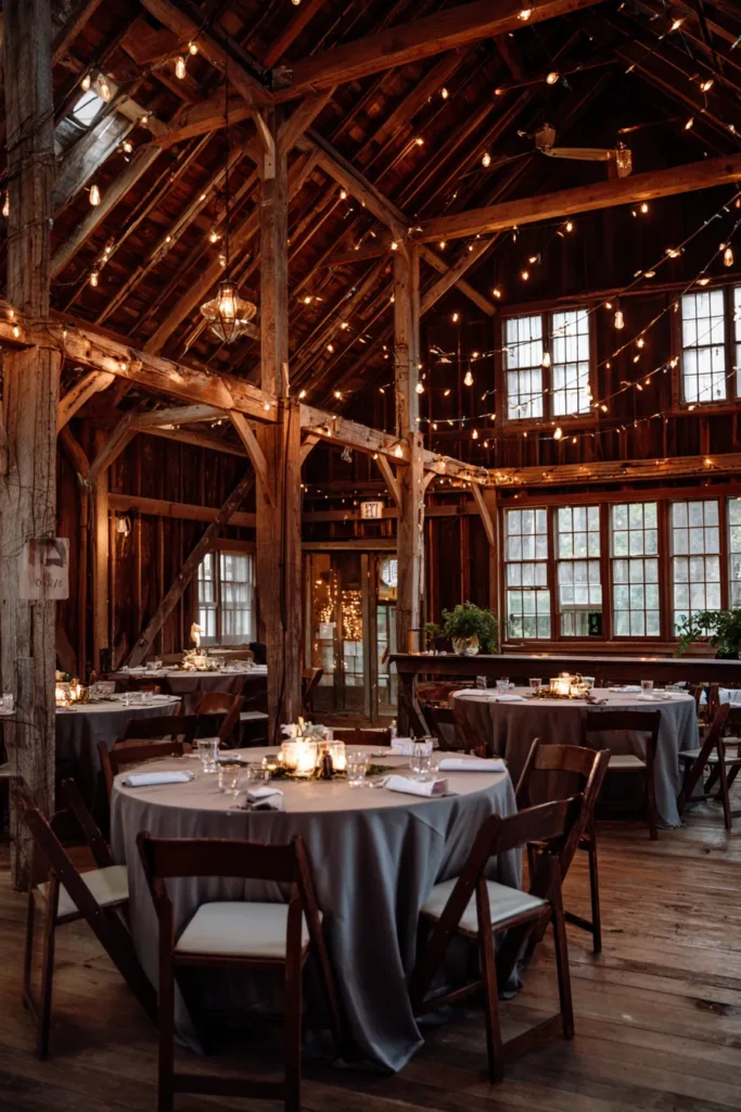 This amazing space takes rustic barn architecture and elevates it to pure romance. The interior features beautiful dark exposed wooden beams and walls, giving it a classic, cozy farmhouse feel. Everywhere you look, warm string lights are draped across the high ceiling and beams, creating a canopy of beautiful, soft light. Round dining tables are set with subtle dove gray linens and classic wooden cross-back chairs. The window wall lets in some natural light, perfectly balancing the dozens of tiny twinkling bulbs for a truly magical glow.