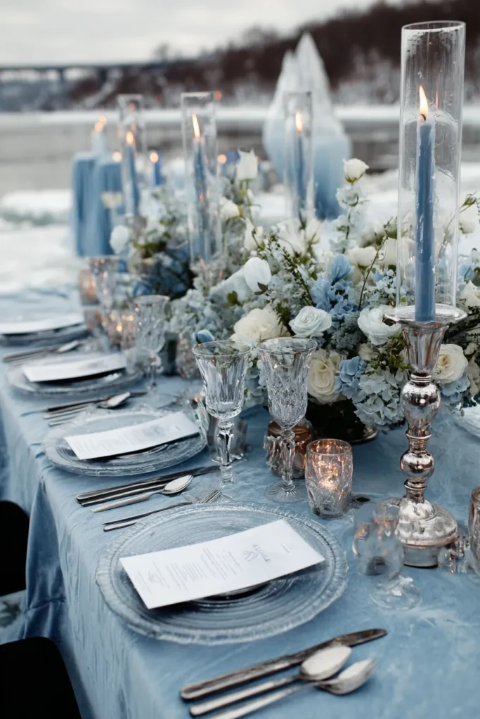 This tablescape is pure enchantment, truly capturing a beautiful, icy fairytale feeling. A velvet baby blue tablecloth creates a plush, shimmering foundation for the look. The place settings feature clear glass chargers with a subtle rippled texture, topped with simple white menus. Tall, elegant silver candelabras hold icy blue pillar candles inside glass chimney hurricane lamps, giving off a soft, ethereal light. The centerpiece is a stunning array of white and powder blue florals, including roses and hydrangea, mixed with greenery for a fresh, snowy garden feel.