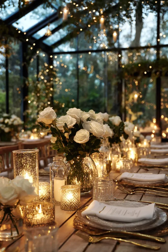 This magical setup is housed in what looks like a beautiful, glass-walled conservatory or greenhouse, giving you a spectacular view of the dark, cozy outdoors. The entire space is draped in hundreds of tiny twinkling fairy lights, creating an overhead sparkle that mimics a clear night sky. The long wooden table is completely covered in a collection of mercury glass votives and pillar candles, casting a super warm, golden glow across the room. Elegant place settings feature gold rimmed glass chargers and pristine white roses are clustered down the center, keeping the look fresh and utterly romantic.