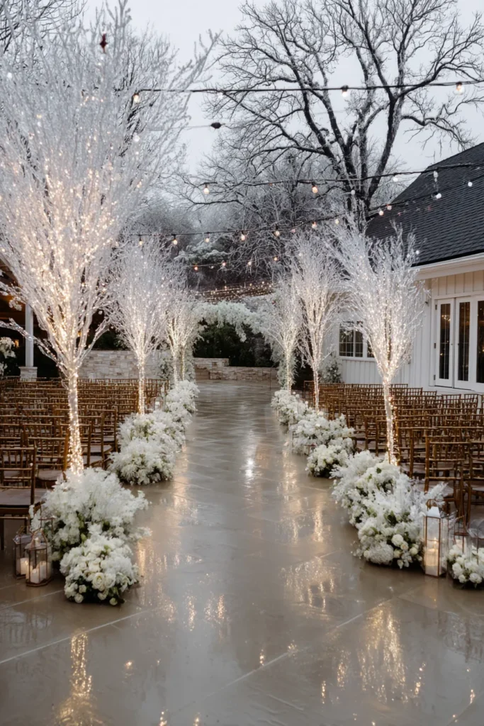 This ceremony setup is a true winter fantasy, creating a magical, snow-covered path for the big walk. The aisle is lined with a row of striking white, frosted trees that are completely wrapped in tiny, warm white string lights. At the base of these trees are lush arrangements of white roses and hydrangeas, looking like fresh snow drifts. The ground is slick with rain, which creates a gorgeous, mirror-like reflection of the glowing lights, adding to the ethereal feeling. Gold chiavari chairs line the path, bringing a touch of warm elegance against the cool, crisp white.