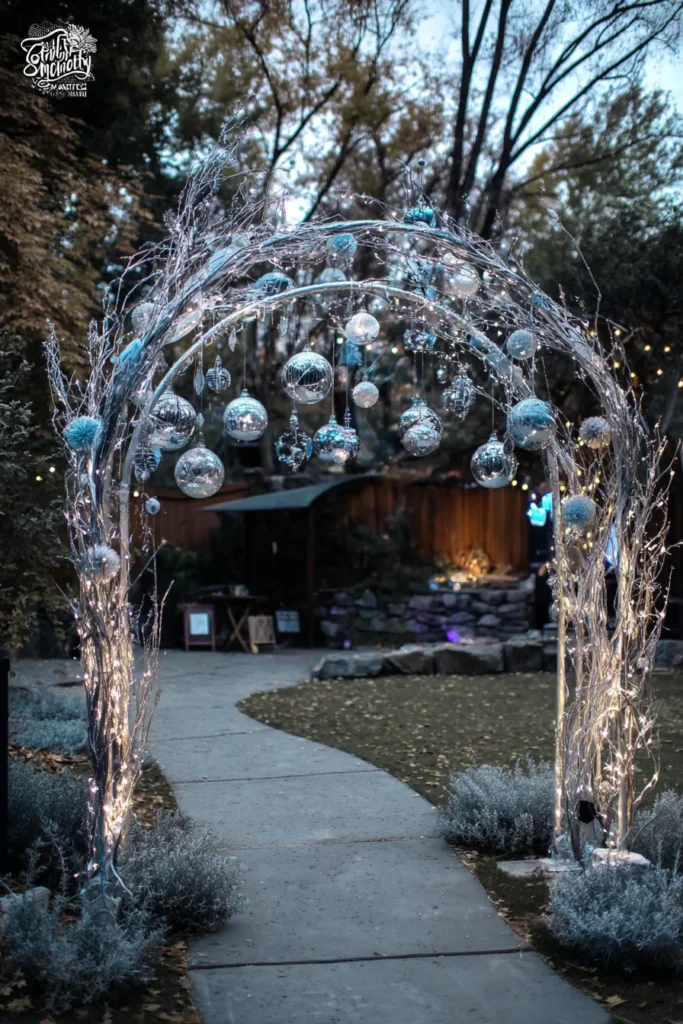 This entryway arch is the definition of winter chic and pure sparkle. The arched structure is completely wrapped in frosted white and silver branches, which are beautifully woven with hundreds of tiny, warm string lights. Hanging from the arch are various sizes of mirror balls and icy blue ornaments, creating a stunning display of shimmer. The arch sits above a curved concrete path, with small, frosty-looking shrubs bordering the way, making it feel like a secret passage into an enchanted winter party.