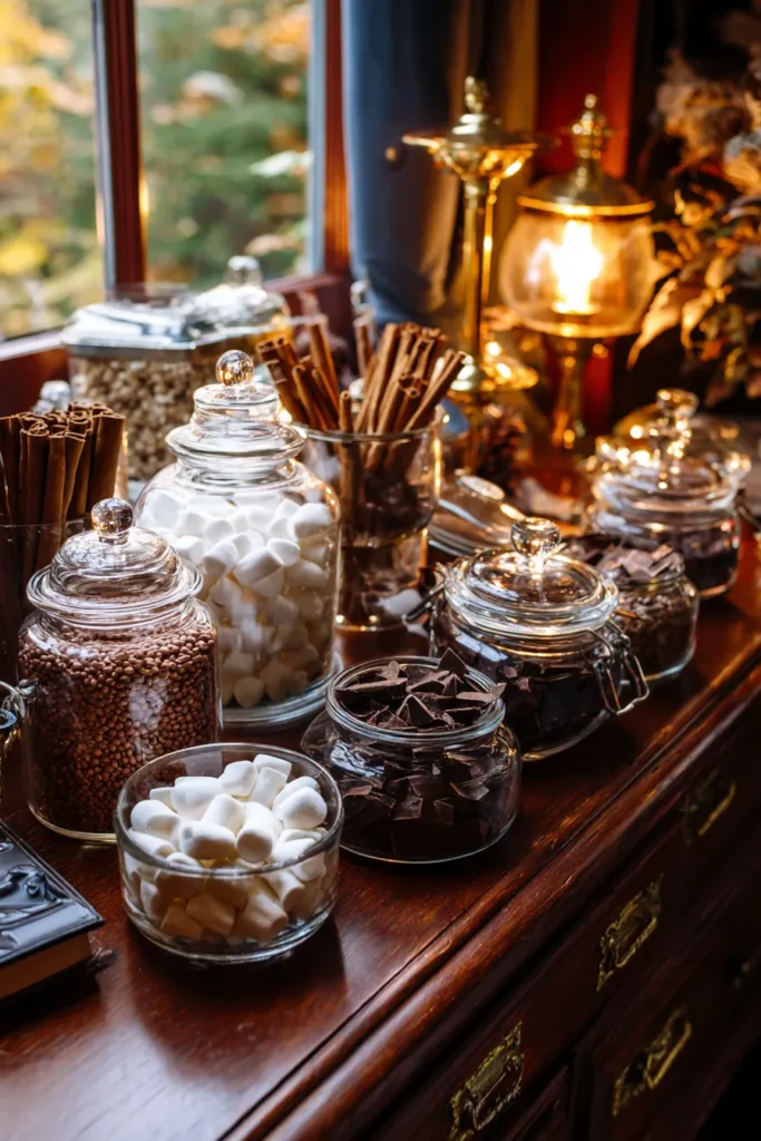 This cozy setup is the ultimate welcoming treat for a winter event, using a stunning dark wood console to display all the goodies. A collection of glass apothecary jars is brimming with every imaginable hot chocolate topping, from tiny marshmallows and chunky dark chocolate shavings to cocoa mix and chocolate chips. Tall glass tumblers hold an impressive amount of cinnamon sticks, perfect for stirring and adding that extra bit of warmth. The whole scene is illuminated by the gorgeous glow of an antique brass lamp on the side, giving it a rich, old-world warmth.