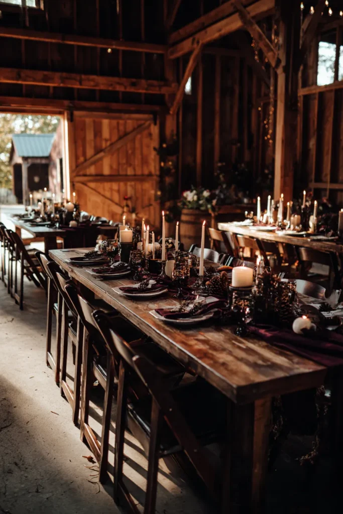 This stunning photo shows a cozy barn reception where rich, dark colors meet natural textures for a truly luxurious winter palette. The long, rustic wooden tables and dark chairs provide a strong, earthy foundation. Down the center, deep burgundy fabric runners contrast beautifully with the wood, layered with dark pinecones and tapered white candles in simple holders. The warm candlelight creates a beautiful ambiance, highlighting the rich, moody tones of the burgundy and the beautiful shadows in the high-ceilinged wooden barn.