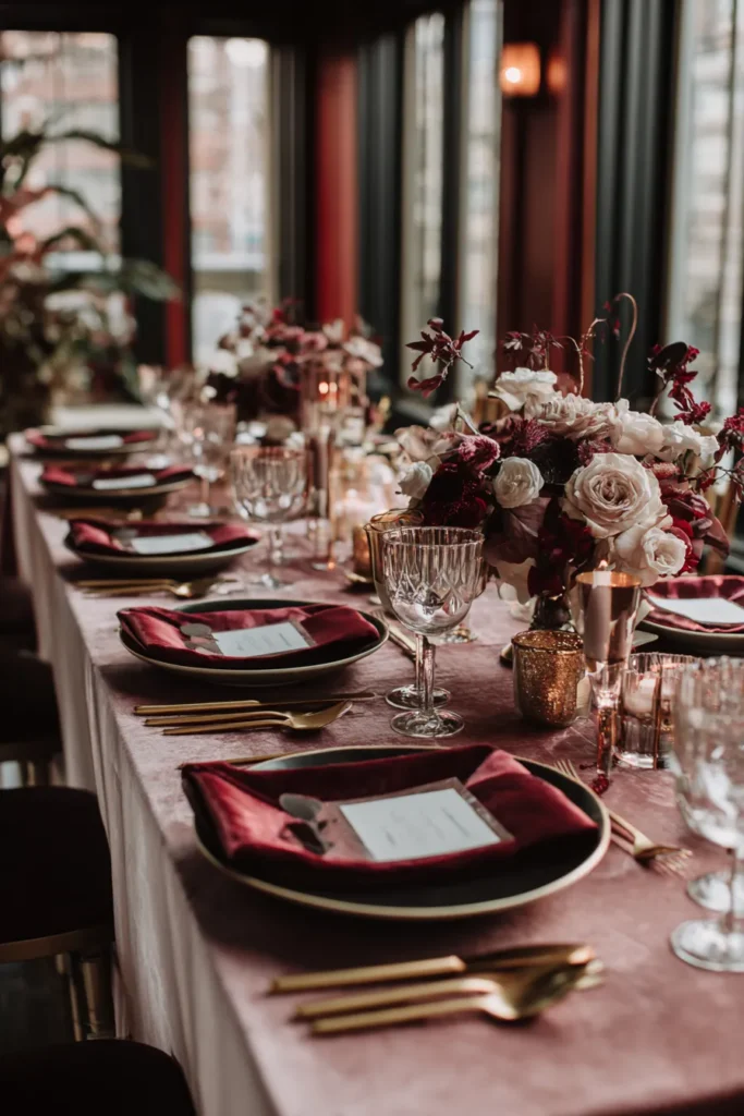 This opulent and glamorous tablescape features a wonderfully deep and luxurious winter palette of velvet pink, cranberry, and striking gold. The table is dressed in a soft pink velvet tablecloth, which instantly screams luxury and warmth. The centerpiece is a lavish floral arrangement of deep reds, blush roses, and rich foliage. Each place setting is dramatically layered with a black plate and a plush, cranberry-colored velvet napkin, which provides an amazing contrast against the pink table. Matte gold flatware and intricate crystal glassware complete the look, creating a feast for the eyes.