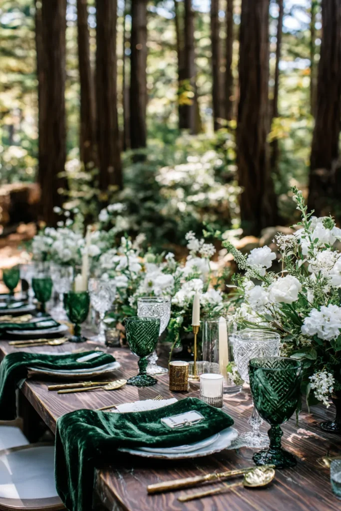 This dinner table is the picture of woodland luxury with its beautiful combination of dark wood, lush green velvet, and sparkling gold accents, set perfectly within a sunlit forest. The dark, rich wood table is the centerpiece, offering a natural and rustic feel. Place settings feature crisp white plates, a simple menu card, and a truly opulent dark emerald green velvet napkin draped across the plate. Beautiful green patterned glassware and polished gold flatware complete the setting, while simple arrangements of white flowers and greenery run down the center, letting the natural surroundings be the star.
