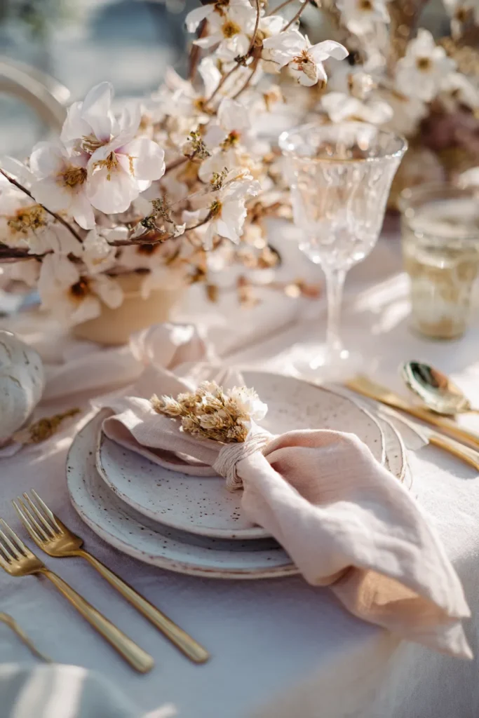 This bright and airy tablescape is the epitome of feminine elegance, using a lovely combination of soft blush, white, and glittering gold. The table is dressed in a light, textured linen, which serves as a subtle base for the delicate details. Place settings feature gold-rimmed plates and chargers, paired with sleek gold flatware. The atmosphere is softened by a blush pink linen napkin placed artfully on each plate, complemented by an abundance of crystal and patterned glass votives and vases that catch the natural light beautifully. Dried florals and scattered amber-toned details complete this sophisticated, warm look.