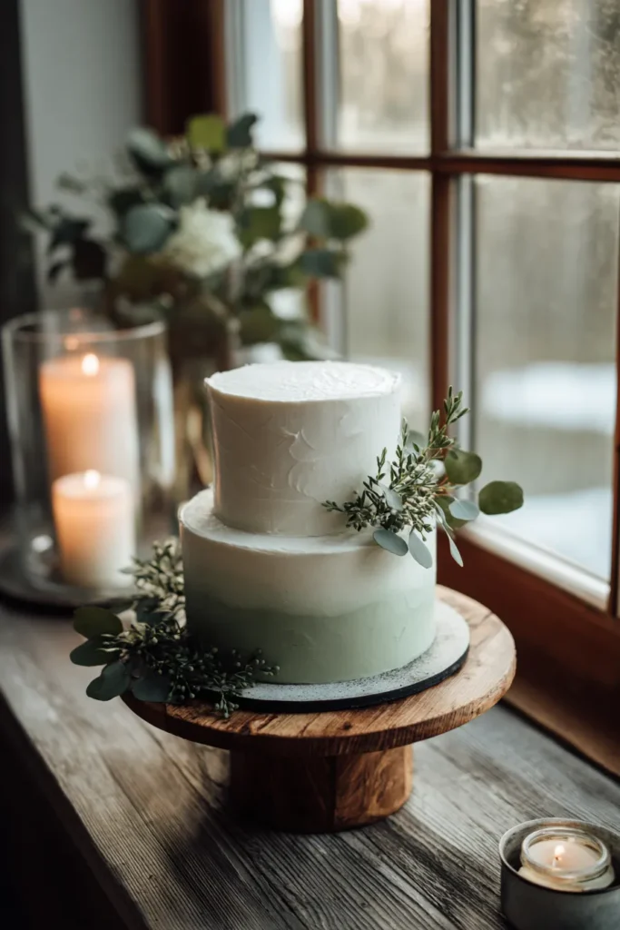 This image beautifully showcases a two-tier white wedding cake that is the picture of soft, natural elegance, perfect for a subtle winter color palette. The cake features a gorgeous texture on the top tier and an ombré sage green effect on the bottom, blending seamlessly into the snowy outdoor view through the window. It rests on a rustic wooden cake stand, bringing warmth to the composition. The decoration is minimal yet stunning, with simple sprigs of eucalyptus and green foliage adorning the sides, giving it a fresh, organic, and incredibly romantic feel.