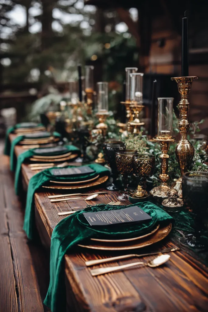 This dinner setup is giving us all the dramatic and luxurious winter cabin vibes, using a rich palette of deep hunter green, natural wood, and dazzling gold. The foundation is a stunning dark wood table with a rich, glossy finish. A lavish emerald green velvet runner cascades down the center, draped beautifully under the place settings. Each spot features a layered look with a gold charger, a black accent plate, and an elegantly folded velvet napkin that matches the runner. Tall gold candle holders topped with sleek black taper candles and dark, patterned glassware complete this incredibly moody and opulent design.
