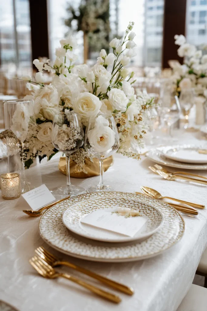 No matter your wedding style, you can’t go wrong with this level of glamour and sparkle! I am completely taken with those intricate gold-patterned plates; they truly elevate the entire setting and are just so timeless. The towering white florals look so fresh and luxurious, and the gold accents really pop against all that white. It’s the perfect look if you want your reception to feel bright, airy, and full of that wonderful, celebratory shine that makes winter events so special.