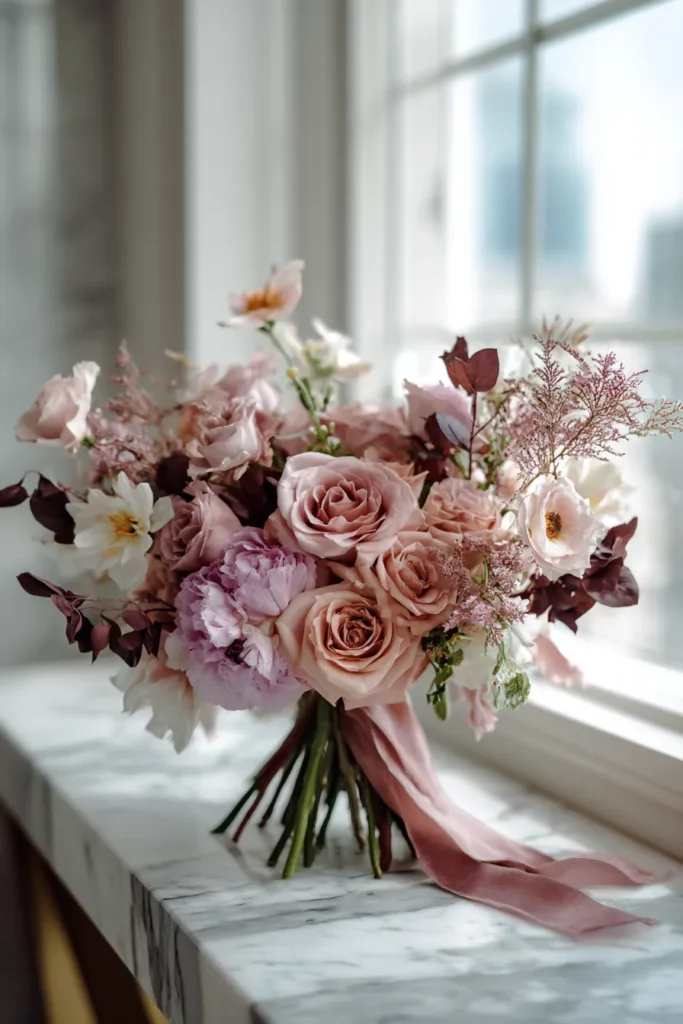 I am completely obsessed with the dreamy, antique feel of this color palette—it’s just so sophisticated and soft for a winter wedding. The way the darker berry tones are woven in keeps the light pinks and whites from feeling too springy, giving it that perfect depth for the season. I especially adore the mix of textures, from the velvety rose petals to the wispy greenery; it makes the bouquet look so organic and luxurious. This design truly captures an ethereal winter romance, and that silky ribbon is the ultimate gorgeous detail.
