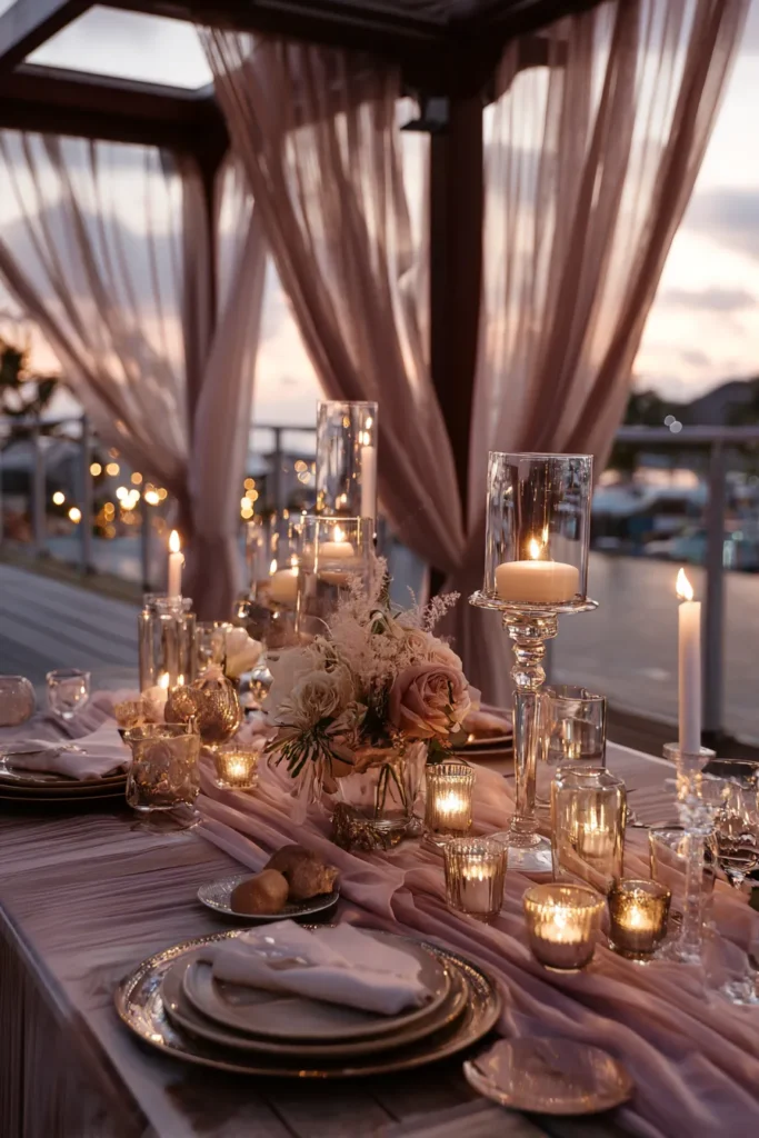 This breathtaking tablescape is all about soft, elegant romance with a dreamy palette of dusty rose, ivory, and shimmering gold accents. The long table is draped with a beautifully flowing mauve/dusty rose fabric runner, creating an incredibly soft texture that catches the dim light. The centerpiece features multiple tall glass hurricanes holding pillar candles and a low arrangement of blush and ivory roses. Place settings are layered with gold charger plates, contrasting with dark plates, and the table is covered in an abundance of mercury glass votives and twinkling candles, creating the ultimate luxurious glow.