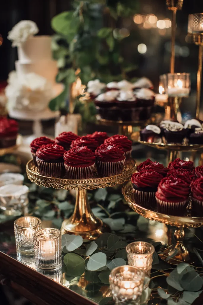 This dessert display is a feast for the eyes, showcasing a beautiful deep red and warm gold color palette for a truly opulent yet cozy winter celebration. Rich red velvet cupcakes with generous frosting are the star, arranged elegantly on raised gold pedestals and trays. The table features lots of shimmering details like gold votive holders and clear glass to reflect the warm candlelight, and soft eucalyptus greenery is woven throughout to add a fresh, natural contrast. A large white floral arrangement and cake stand peek out in the background, completing this lush and inviting dessert bar.