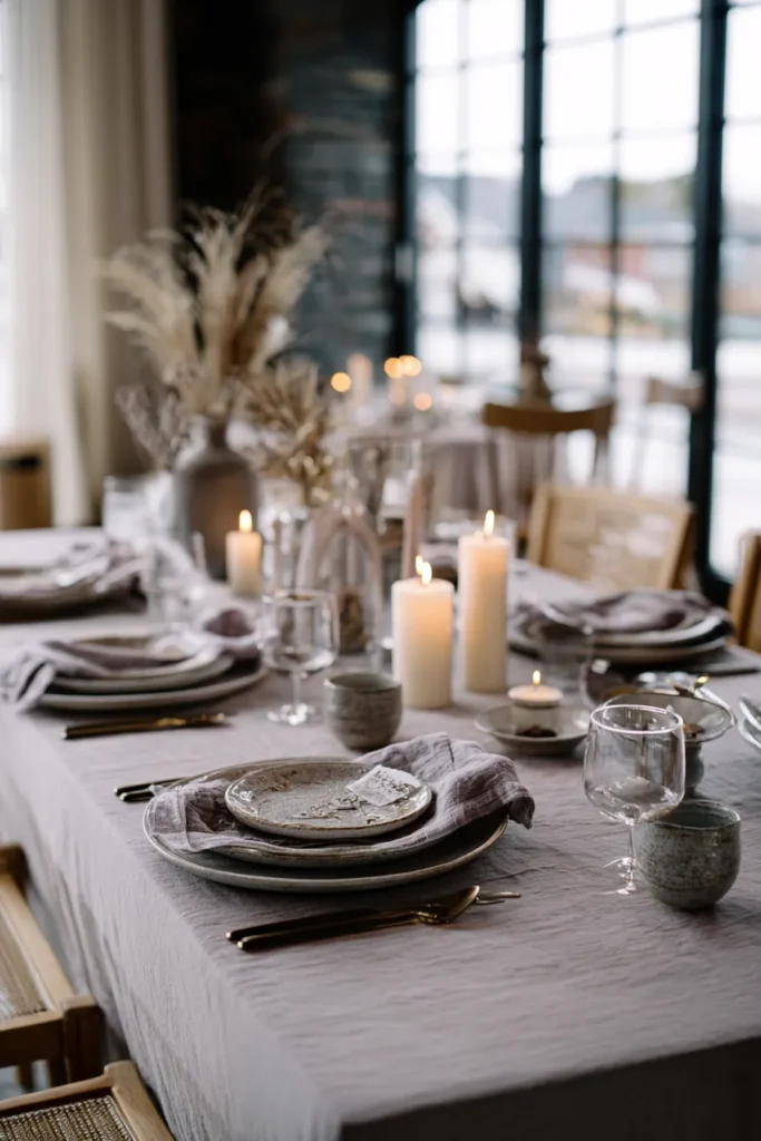 I just love how wonderfully calm and sophisticated this look feels—it’s proof that neutrals are anything but boring! The combination of the different textures, especially that soft linen against the darker wood, makes everything feel so incredibly luxurious and inviting. The simple, organic floral arrangements and the glow of those tall white candles create such a cozy and intimate atmosphere, which is exactly what you want when celebrating during the colder months. It’s the perfect blend of modern simplicity and rustic warmth.