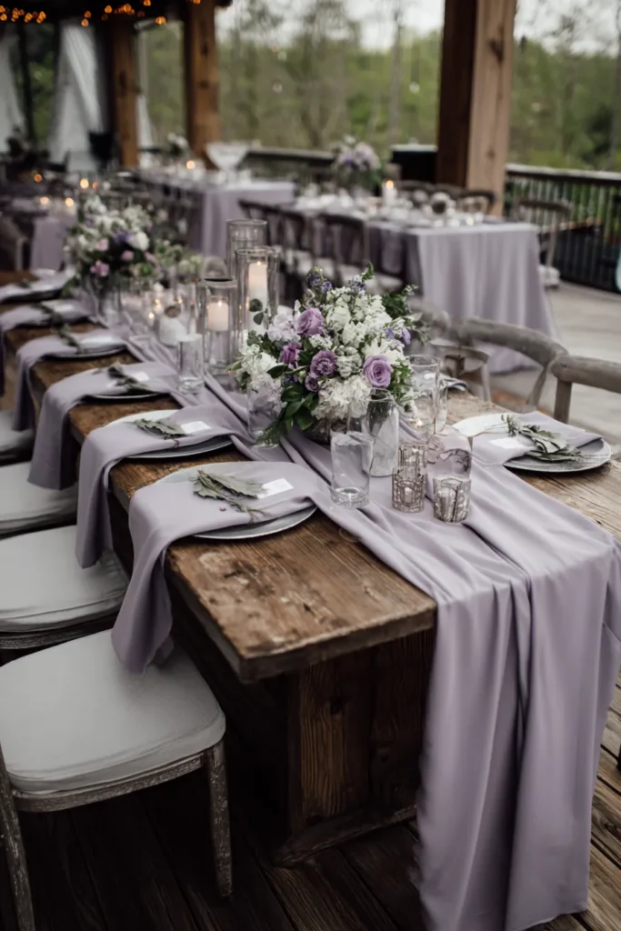 This beautiful outdoor reception space perfectly marries rustic textures with soft, sophisticated colors like dusty lavender and white. The entire area is covered by a wooden pergola or deck structure, giving it a natural, cozy feel. The long rustic wooden tables are topped with a flowy lavender fabric runner that drapes beautifully over the sides. The centerpiece is a mix of white and lilac roses nestled among lush greenery, with clear glass hurricanes holding pillar candles, creating a soft, romantic light. White dining chairs and layered plates with a little sprig of greenery complete this gorgeous, unique color palette.