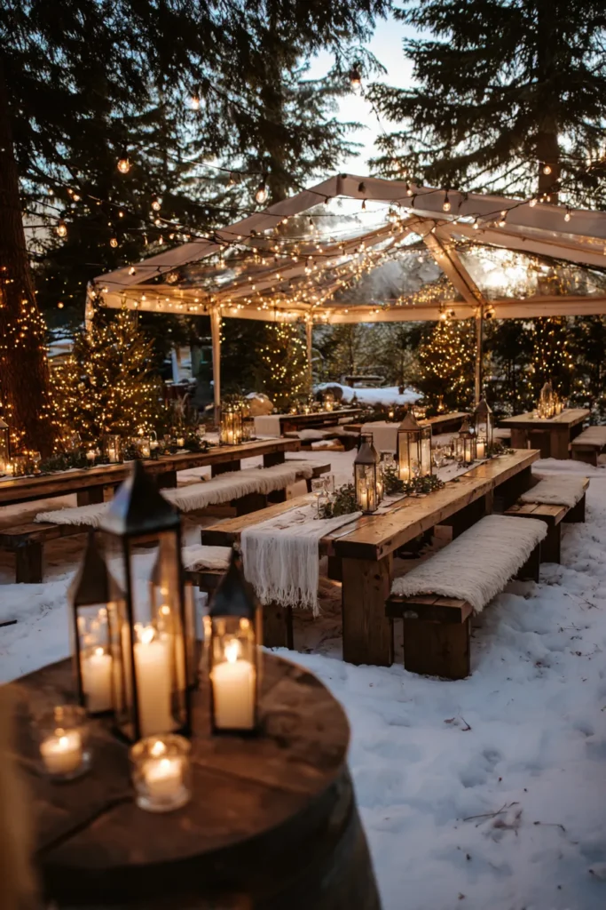 This setup is like being inside a perfect little snow globe. A clear tent creates a cozy bubble right in the middle of a snowy forest. It’s strung with what looks like a million tiny fairy lights, making the whole place glow. Rustic wooden tables and benches are softened up with white fluffy throws, inviting guests to get comfortable. Lanterns holding warm candles are everywhere, lighting up the tables and the snowy paths.