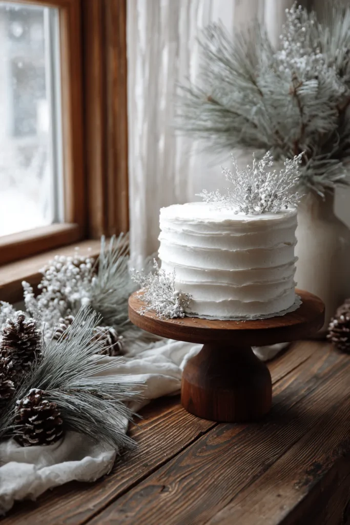 This image gives us a close-up of the most charming winter-themed wedding cake surrounded by gorgeous natural elements. The cake itself is a simple, single-tier beauty with classic white, textured buttercream frosting, elevated on a warm, rich wooden cake stand. It is beautifully framed by snowy pine boughs, frosted berries, and a smattering of natural pinecones, all creating that perfect “freshly fallen snow” look. The cozy, raw wood windowsill and the soft natural light pouring in make the setting feel so intimate and incredibly inviting.
