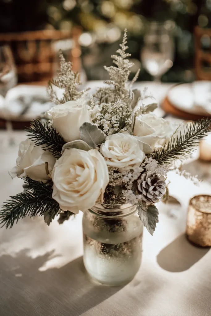This close-up image shows a perfectly sweet and charming winter floral centerpiece, ideal for intimate celebrations. The bouquet is arranged simply in a clear glass mason jar, which gives it that adorable, rustic vibe we all love. It features soft, creamy white roses, sprigs of dark evergreen pine, frosted pinecones, and dusty miller foliage, giving it a wonderfully textured and snowy appearance. The natural light highlights the dewy freshness of the flowers and the casual elegance of the setting.