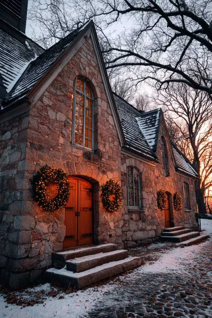 This image showcases the most enchanting stone cottage, looking like it stepped right out of a winter fairy tale! The home features beautiful, rustic stonework that gives it so much character, topped with a steep gabled roof lightly dusted with snow. Warm, inviting light spills from the windows and those incredible round evergreen wreaths, sparkling with tiny fairy lights, adorning the handsome wooden doors. Bare winter tree branches frame the top of the house against a soft twilight sky, adding to that ethereal, peaceful feeling. It’s absolutely dripping with holiday charm and cozy elegance.