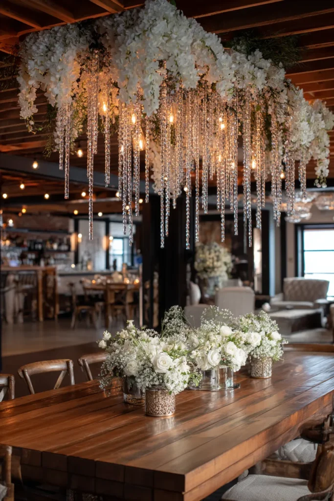 This stunning image captures a truly luxurious wedding reception detail with a spectacular floral chandelier hanging dramatically over a warm wooden table. The display features masses of cascading white blooms, primarily orchids and hydrangeas, creating a fluffy cloud effect right above the centerpiece. Hanging down from the flowers are numerous strands of sparkling crystals, catching the light and mimicking melting icicles for the ultimate winter glamour look. The dark wood ceiling and industrial-chic exposed light bulbs add a wonderful contrast to all that beautiful floral lightness.