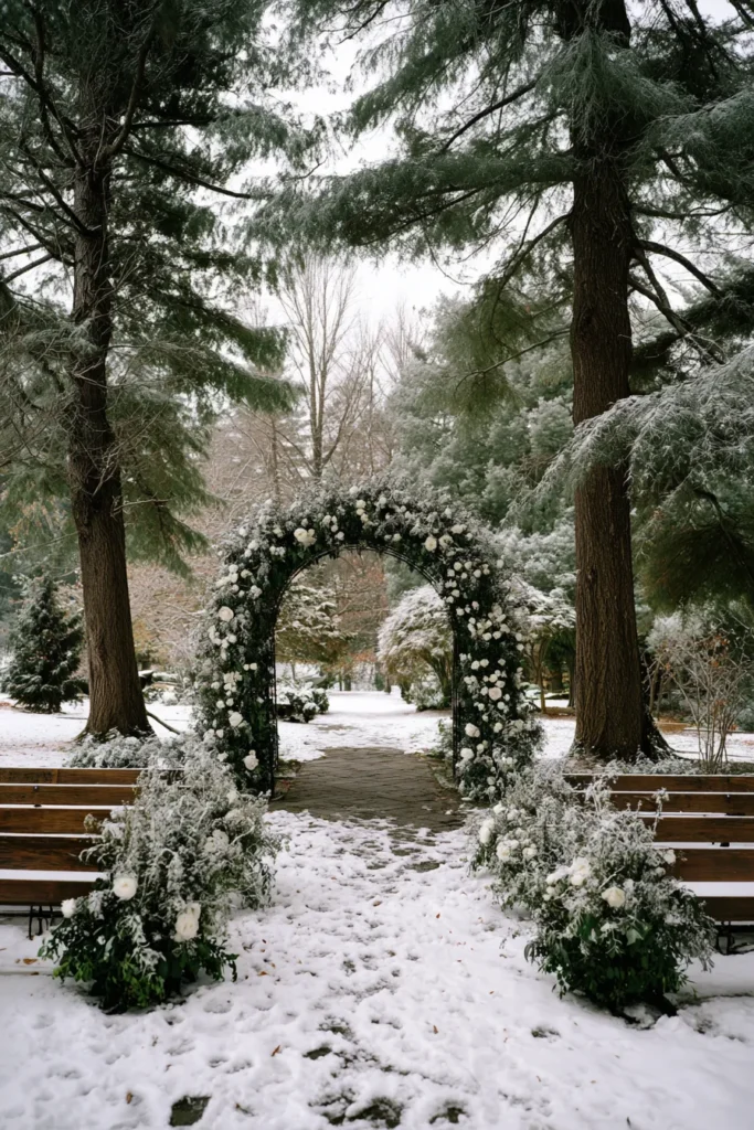 This picture captures the most romantic outdoor wedding ceremony setting, perfectly embracing the beauty of a snowy landscape. The pathway is dusted with crisp white snow, leading to an absolutely stunning dark archway completely covered in lush green foliage and mass amounts of beautiful white flowers. The structure is flanked by towering, dark pine trees and simple wooden benches for guests, giving the space a natural, chapel-in-the-woods feeling. The snow clinging to the evergreen branches and the white flowers creates a beautifully cohesive and incredibly romantic winter wonderland aesthetic.