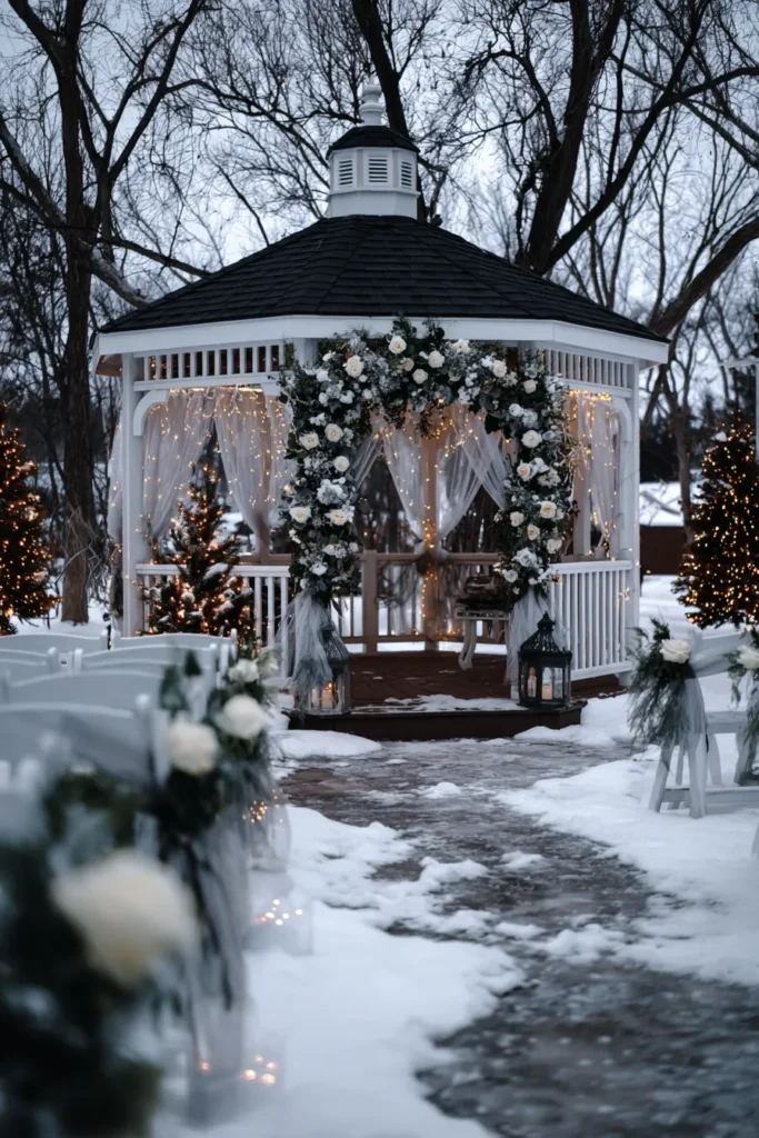 This image captures the most charming outdoor ceremony setting, nestled inside a darling white gazebo under a blanket of snow. The entire structure is transformed into a winter haven, featuring a gorgeous floral archway covered in frosted white roses and lush silver-dusted greenery at the entrance. Soft, sheer drapery hangs between the white railing posts, and little string lights twinkle throughout the greenery and around the structure, casting a warm, romantic glow against the cold, bare trees. The aisle is dusted with snow and lined with white chairs, marking the path to this picturesque spot.