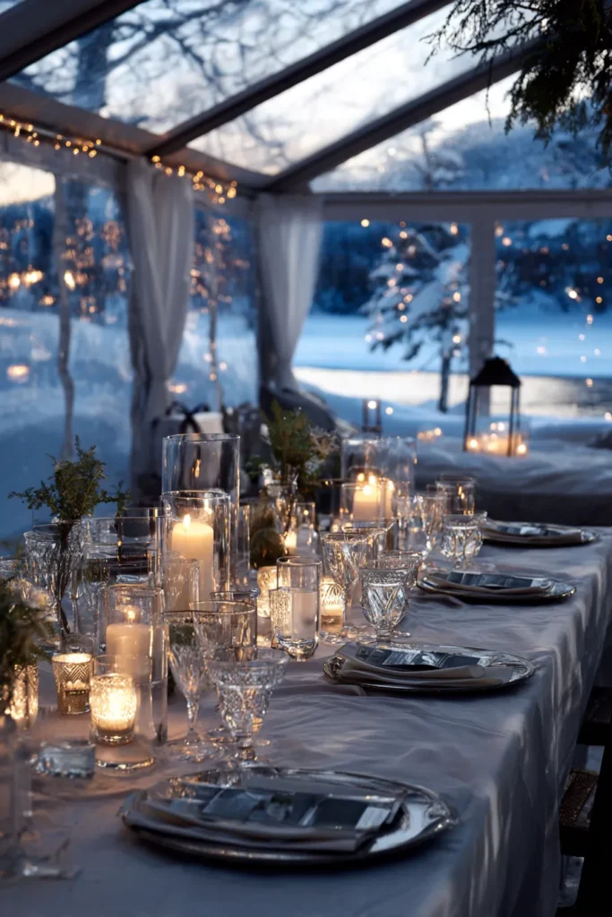 This breathtaking image shows a truly elegant winter wedding reception set within a clear-top tent, giving guests panoramic views of a beautiful snowy landscape. The long tables are dressed in soft, ethereal linens and absolutely glow with dozens of flickering candles in varying heights and styles of clear glass. Silver charger plates and delicate crystal glassware add a touch of refined sparkle, while sparse green sprigs bring in that natural, wintery feel without being overwhelming. Outside, the trees are strung with twinkle lights, creating a magical backdrop that truly makes you feel like you are dining under the stars in a winter wonderland.