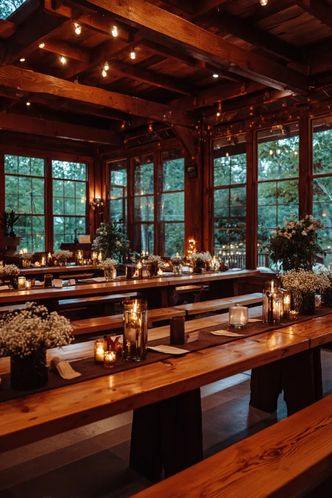 I am head-over-heels for this reception space because it feels so incredibly warm and authentic, like celebrating in the coziest mountain cabin! I love the simple but impactful décor—the dark, rich wood of the tables and chairs provides such a beautiful, grounded feeling, while the abundance of candlelight makes the whole space feel intimate and wonderfully romantic. It just proves that you can have a refined wedding celebration without losing that genuine, rustic charm!
