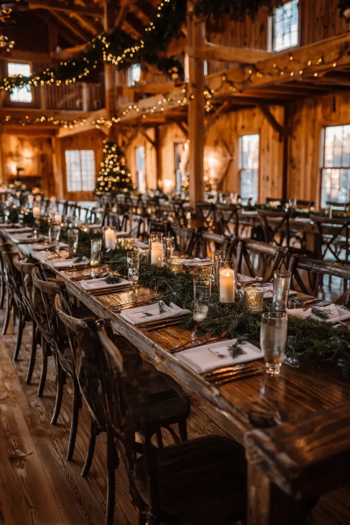 I am completely obsessed with how perfectly this setting blends rustic charm with pure elegance! That huge, crackling fireplace just makes you want to snuggle up and stay awhile, and the way the frosty evergreen garland looks against the warm wood is pure genius. I love how it feels sophisticated but still incredibly homey and welcoming—it’s seriously the ideal spot for a small, intimate winter wedding reception or even a rehearsal dinner that feels like a big family gathering. Every detail here just screams “dreamy winter celebration”!