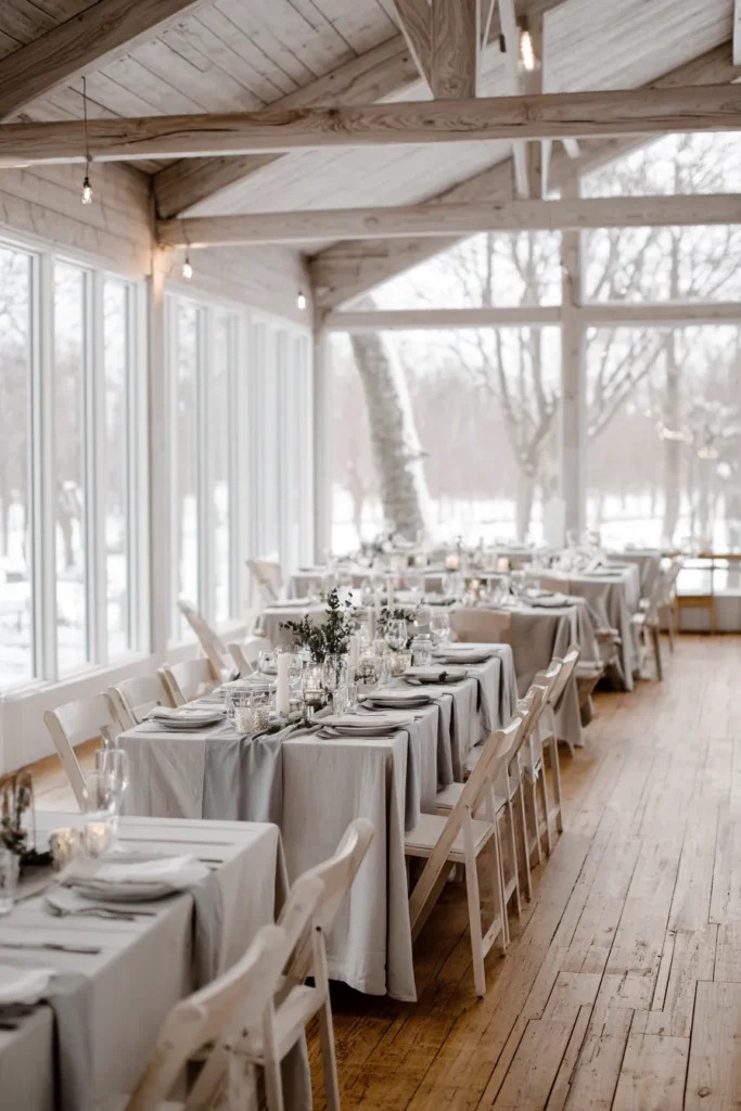 This image showcases a breathtakingly bright and airy reception hall, perfect for a chic and sophisticated winter wedding. The space features stunning vaulted ceilings with exposed white-washed wooden beams and a warm, natural wood floor. Huge, floor-to-ceiling windows wrap around the entire room, offering panoramic views of the snowy landscape outside and bathing the interior in soft, diffused light. Long banquet tables are elegantly set with understated grey linens, clean white plates, and minimalist centerpieces featuring delicate greenery and glowing votive candles.