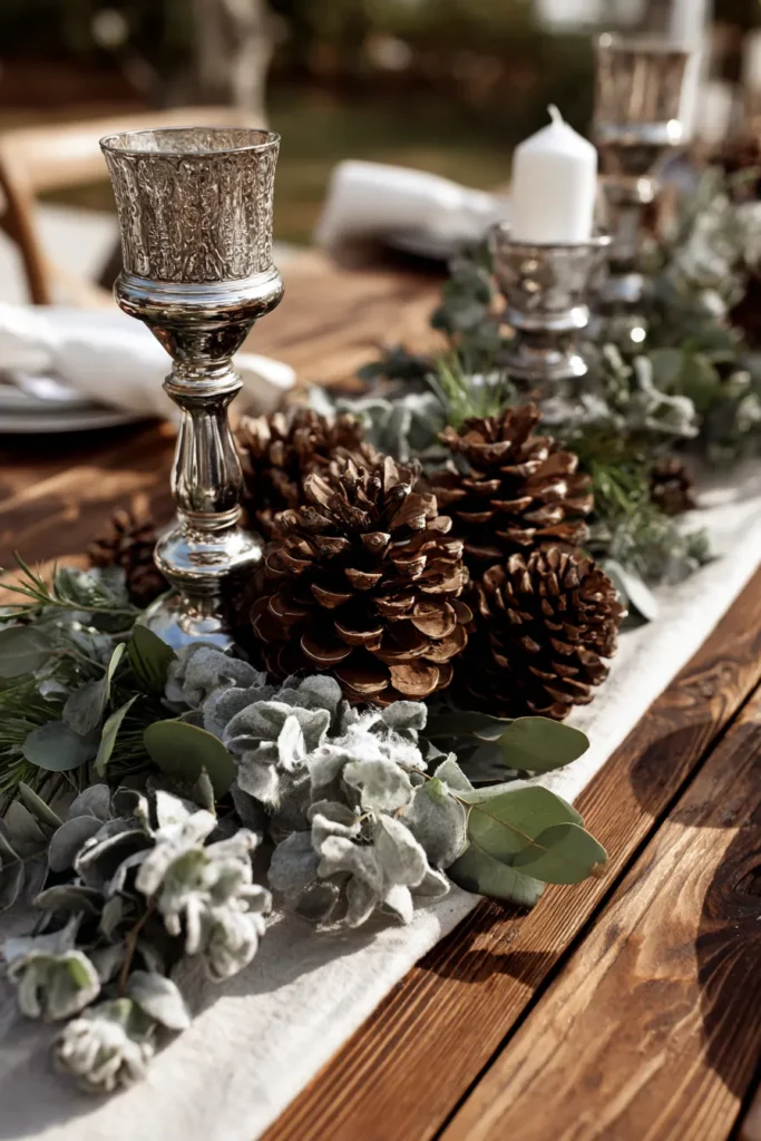 This centerpiece is the definition of rustic chic. A soft, neutral linen runner creates a base on a gorgeous natural wood table. The star of the show is a lush garland made of silvery lamb’s ear, eucalyptus, and pine sprigs. Tucked inside are big, beautiful pinecones, adding that perfect touch of woodland charm. For a bit of glam, tall mercury glass candle holders mix with shorter silver ones, all holding simple white candles.