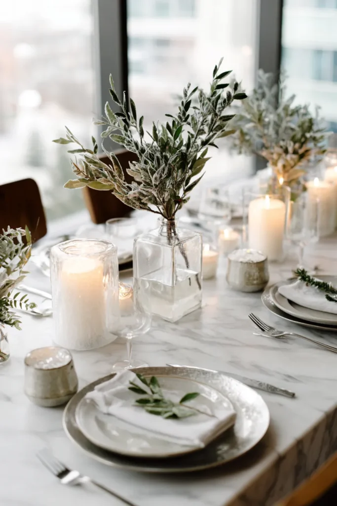 This close-up captures the ultimate sophisticated yet cozy winter table setting, proving that simplicity is truly chic! The reception takes place at a sleek white marble table, which provides a stunning, cool backdrop for the warm elements. Centerpieces are kept minimal and modern, using clear square glass vases filled with just a few sprigs of frosted olive branches or lamb’s ear, perfectly balancing rustic texture with high-end design. The place settings feature subtle gray charger plates, crisp white napkins, and tons of soft candlelight from chunky pillar candles and unique textured votives, creating the most romantic glow.