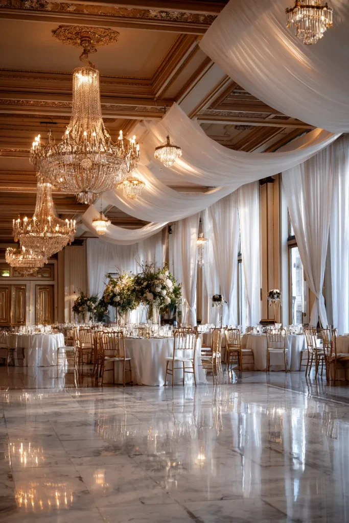 This is a picture of the most breathtakingly elegant ballroom, completely perfect for a luxury winter wedding that’s all about glamour. The room features a spectacular high ceiling with ornate gold trim and multiple layers of molding, creating an incredibly opulent feel. Cascading white drapery softens the large windows and high ceiling, balancing the grandeur of the space. The real stars of the show are the multiple tiers of massive crystal chandeliers, casting a shimmering, golden light over the bright white marble floor that reflects all the beautiful light.