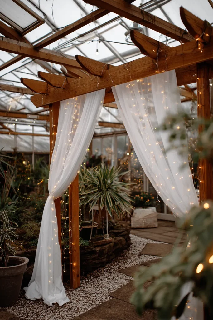 I am completely obsessed with this gazebo setup; it feels so intimate and wonderfully elegant, even outside in the cold! The contrast between the stark white snow and the warm, inviting light from the strings of fairy lights is just pure magic. I love how the florals look so heavily frosted, blending perfectly with the winter scene while the draped fabric makes the whole space feel sheltered and incredibly romantic. It’s truly a storybook spot for exchanging vows!