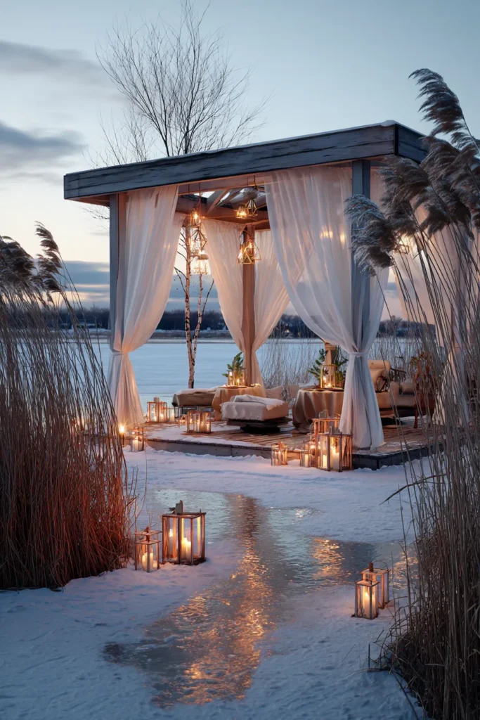 This picture gives us such a cozy, intimate scene with a lovely outdoor cabana or pavilion transformed into a dreamy winter lounge area beside a frozen body of water. The wooden structure is draped with sheer white fabric curtains, which are softly illuminated by twinkling string lights and multiple hanging lanterns. The setting is surrounded by natural, tall dried grasses and a dusting of snow, while many ground lanterns cast a warm, welcoming glow along the icy path leading up to the lounge. It creates a secluded, incredibly romantic spot for a late-night chat or cocktail.