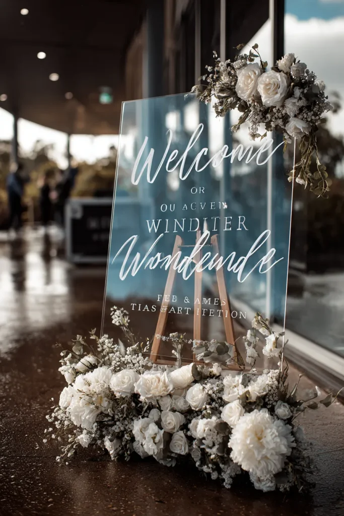 This image showcases a perfectly chic and modern wedding welcome sign that immediately tells guests they’ve arrived at a dreamy winter celebration. The sign itself is made from clear acrylic, giving it a sleek, contemporary feel, with elegant white calligraphy that reads “Welcome to Our Winter Wonderland.” It is gorgeously framed by lush arrangements of pure white roses and other full white blooms, mixed with soft greenery that looks subtly frosted. This simple piece of décor is elevated by sitting on a rustic wooden easel, creating a lovely contrast of textures.