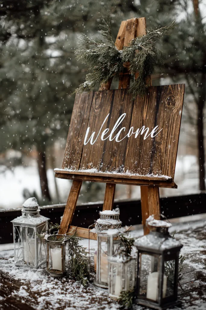 This welcome sign is all about rustic charm and winter elegance. A beautiful dark wood sign with “Welcome” in a flowing script stands on a simple wooden easel. A dusting of fresh snow covers the top of the sign and the base, making it feel perfectly at home in the wintery landscape. Fluffy pine branches are tucked into the top of the easel, adding a touch of natural greenery. Grouped around the base are several charming lanterns, some white, some dark, all holding warm flickering candles.