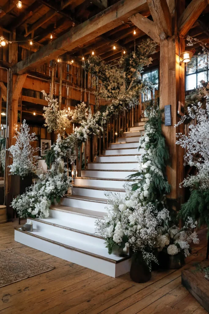 I just melt over this kind of décor—it’s so incredibly dramatic and wonderfully romantic! I love how the crisp white and green of the flowers pops against the warm, dark wood of the barn, achieving that perfect balance of rustic texture and elegant refinement. Imagine walking down these stairs in your dress; it would feel like stepping right into a snowy fairy tale. This is such a brilliant way to turn a functional part of a venue into the most breathtaking photo opportunity.