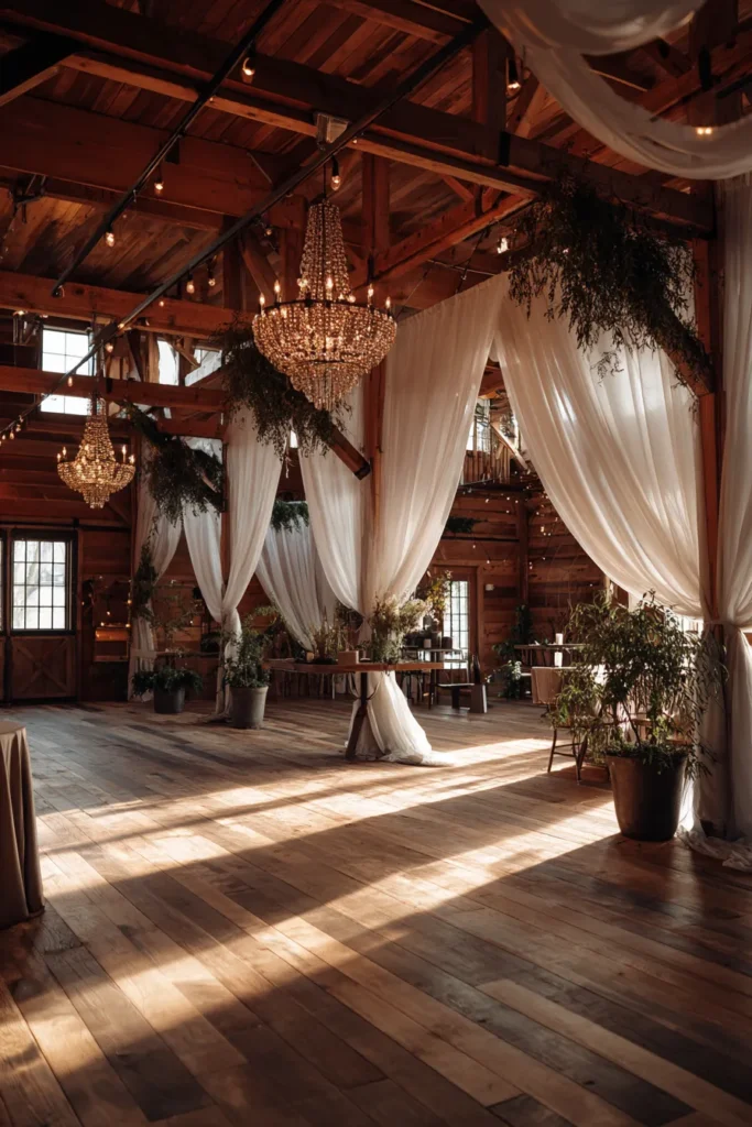 This beautiful image showcases a rustic barn venue totally transformed into an elegant, warm-weather reception space. The soaring wooden ceiling and exposed timber beams bring that cozy, natural vibe we all adore, but the heavy white draping and sparkling crystal chandeliers seriously elevate the whole look. Sunlight streams across the rich wooden floorboards, highlighting the potted greenery and the sheer white fabric that softens the space and creates intimate little seating nooks. It’s the perfect blend of countryside charm and total sophisticated glamour.