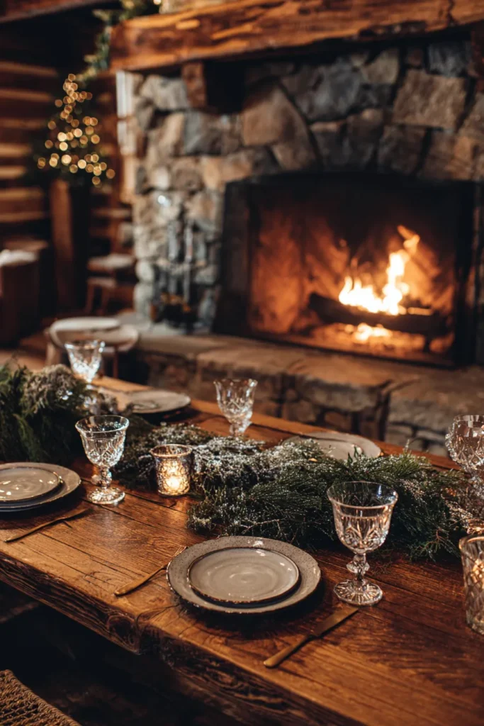 This picture shows off the most incredibly inviting dining setup within what looks like a super cozy rustic cabin or lodge. The star of the show is clearly that magnificent stone fireplace, roaring away and casting the warmest glow over everything. A long, sturdy wooden table is beautifully set with simple, elegant plates and gorgeous vintage-style glassware. The centerpiece is a lush garland of snowy evergreens, dotted with glowing votives that create such an intimate and festive atmosphere. In the background, you can just spot a little twinkling Christmas tree, adding to the magical winter wonderland feel.